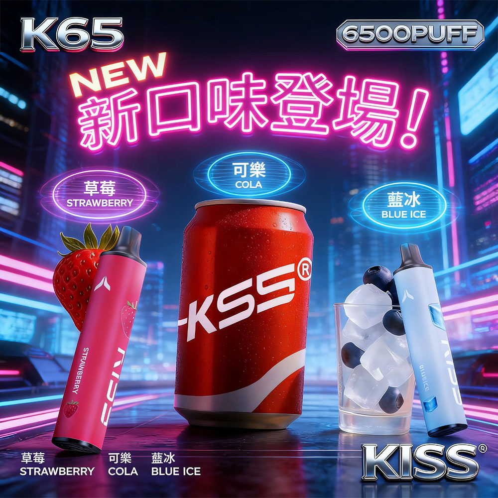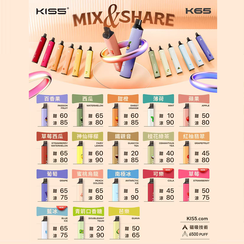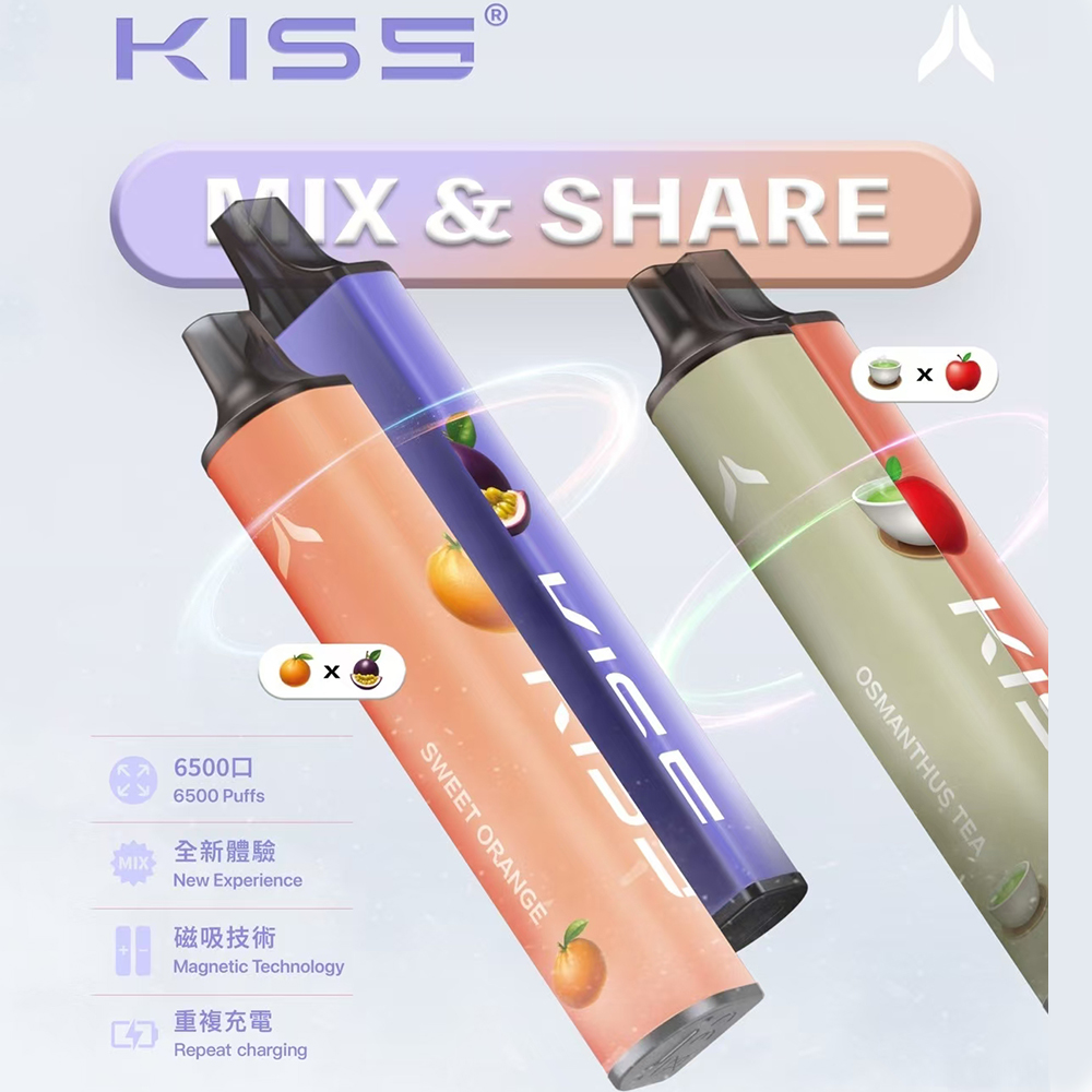 Kiss 6500 Puffs 鎧斯5號拋棄式 產品特點 ✅ 超長續航:6500口超大容量,持久滿足使用需求 ✅ 豐富口味:15+種流行風味(水果、冰涼、甜品等系列) ✅ 強勁口感:尼古丁鹽配方,擊喉感順滑,滿足感迅速 ✅ 智能電芯:內建500mAh電池,電量同步煙油耗盡 ✅ 防漏設計:升級陶瓷芯技術,防漏油且霧化細膩 ✅ 便攜輕巧:筆形流線機身,僅重50g