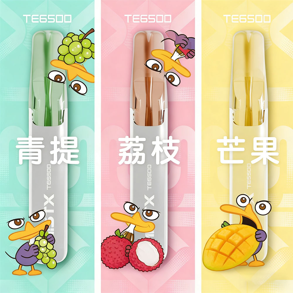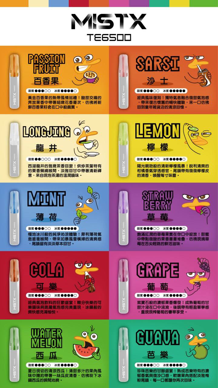 產品規格 型號:MISTX TE6500 鴨嘴獸 類型:一次性拋棄式 容量:16mL 吸口數:約 6500 口 尼古丁:2%(20mg/mL) 電池:550mAh(不可充電) 霧化芯:網紋陶瓷 Mesh Coil 主要成分:VG、PG、食用香料、尼古丁鹽 產品亮點 🦆 獨特鴨嘴外型,吸感更舒適 扁平鴨嘴吸頭貼合唇形,兼具手感與視覺亮點,隨身攜帶就是焦點。 🔥 升級陶瓷 Mesh Coil|口感提升 50% 導油更乾淨、霧化更均衡,每一口都濃郁穩定,不燒味、不滑油。 🚀 6500 口超長續航,免充電更省心 內建 550mAh 電池+16mL 超大油倉,整支抽完無需任何充電設備。 🍭 10 款精選口味,香氣層次更豐富 每款皆標示甜度/涼度,挑選更直覺,口感穩定不混味。 👜 開箱即用|真正懶人設計 不用加油、不用更換、不用清潔,用完即丟最方便。![]()
